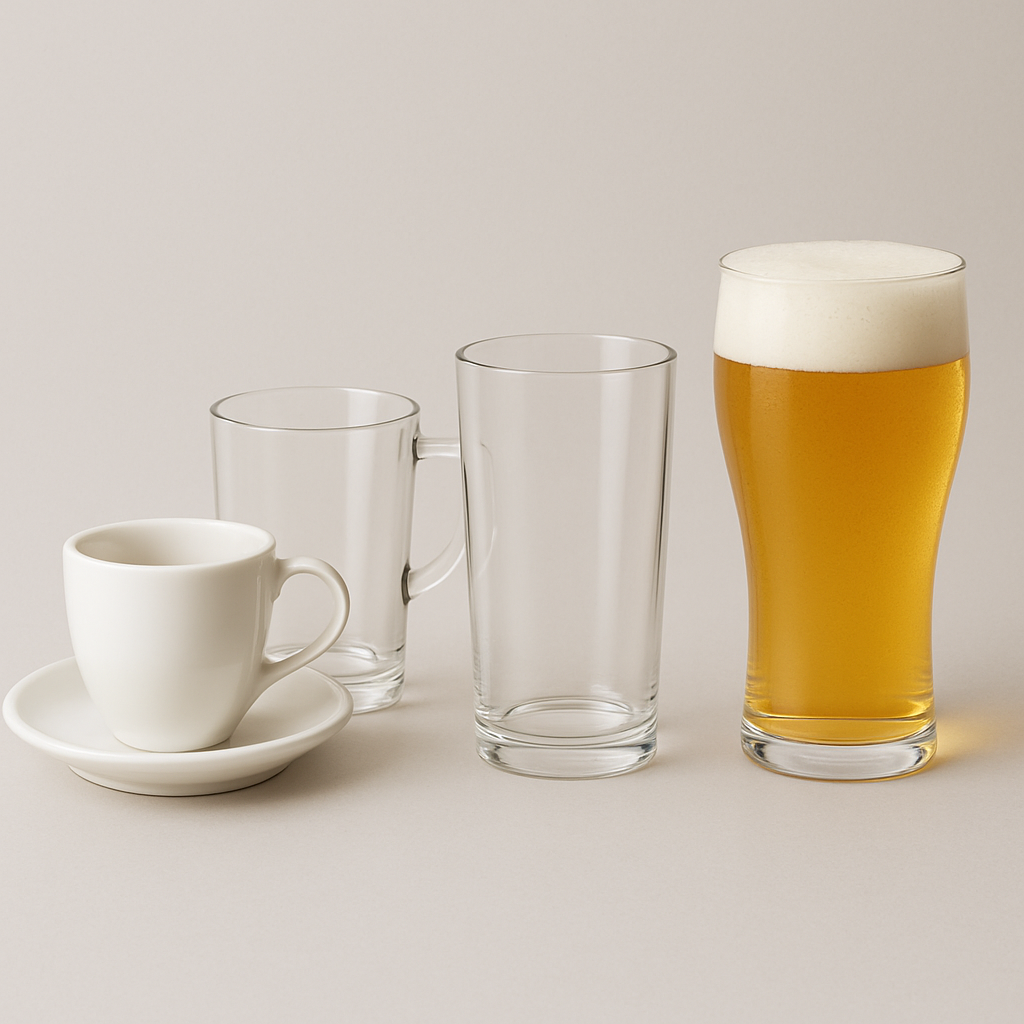 Bierpullen, bierglazen, koffie, thee en frisdrank glazen